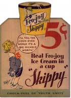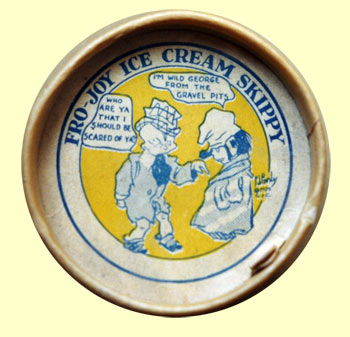 Rare smaller size 2-color (yellow background) Skippy Lid. This lid is in excellent condition measuring 2 5/8" in diameter with a 1929 copyright date. This is one of a set of six Skippy Lids. The other size variations of this set are larger with no colored background. Percy Crosby granted this license to General Ice Cream Co., New York, (c) 1929. The federal trademark was registered in 1929 and assigned to Skippy, Inc. in 1932. Licensing for ice cream is available from Skippy, Inc. Contact licensing director, joan@skippy.com. |