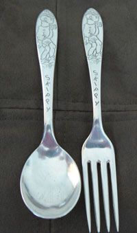 Made under license to International Silver Co. (childrens' silverplate bowls, plates,cups, flatware and napkin ring). |