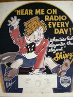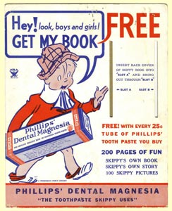 Store counter display, nationwide promotion by "Skippy" radio sponsor, Phillips toothpaste for comic book premium, 1934. The prime time radio program had 500,000 Skippy fan club members. ©Percy Crosby, 1934; Skippy, Inc. 2009.