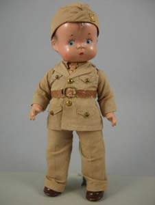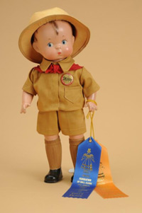Percy Crosby's lovable character from the Golden Age of comics. Joan designed this doll as the first lifelike "Skippy", and commissioned sculptor Lewis Goldstein to make him with porcelain head & composition body, dedicated to Skippy's creator. The doll, with his famous little dog (porcelain) & wagon, was nominated for 2 prestigious DOTY awards in 1990, including "Doll of the Year", is 13" tall, with real leather shoes, hand-knit socks, and a custom made wool outfit by Maine artisans. Only 125 dolls were made, which sold for $395. Joan has several left, now valued at $1,000 ea. Molds were destroyed to prevent infringing copies. No other American-made doll has such a fascinating history and adventures seeking his freedom from his captors...including Skippy's petition to the U.S. Supreme Court to protect his name and persona. |