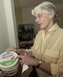 ![]() Joan Crosby Tibbets holds a plastic bucket that held popcorn showing her father Percy Crosby's cartoon character "Skippy" Thursday, Aug. 16, 2001, in her home in Annandale, Va. The bucket design with her father's copyrighted "Skippy" trademark started a lawsuit against the makers of Skippy peanut butter. Tibbets has been battling to protect her father's "Skippy" copyright against the makers of Skippy peanut butter. Tibbetts' legal battle came to an end Monday, April 5, 2004, when the U.S. Supreme Courtrefused to hear her suit against Skippy's manufacturer, a division of the multinational conglomerate Unilever. Tibbetts says she'll continue her battle in the court of public opinion. (AP Photo/Linda Spillers)